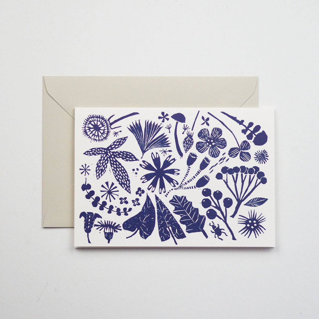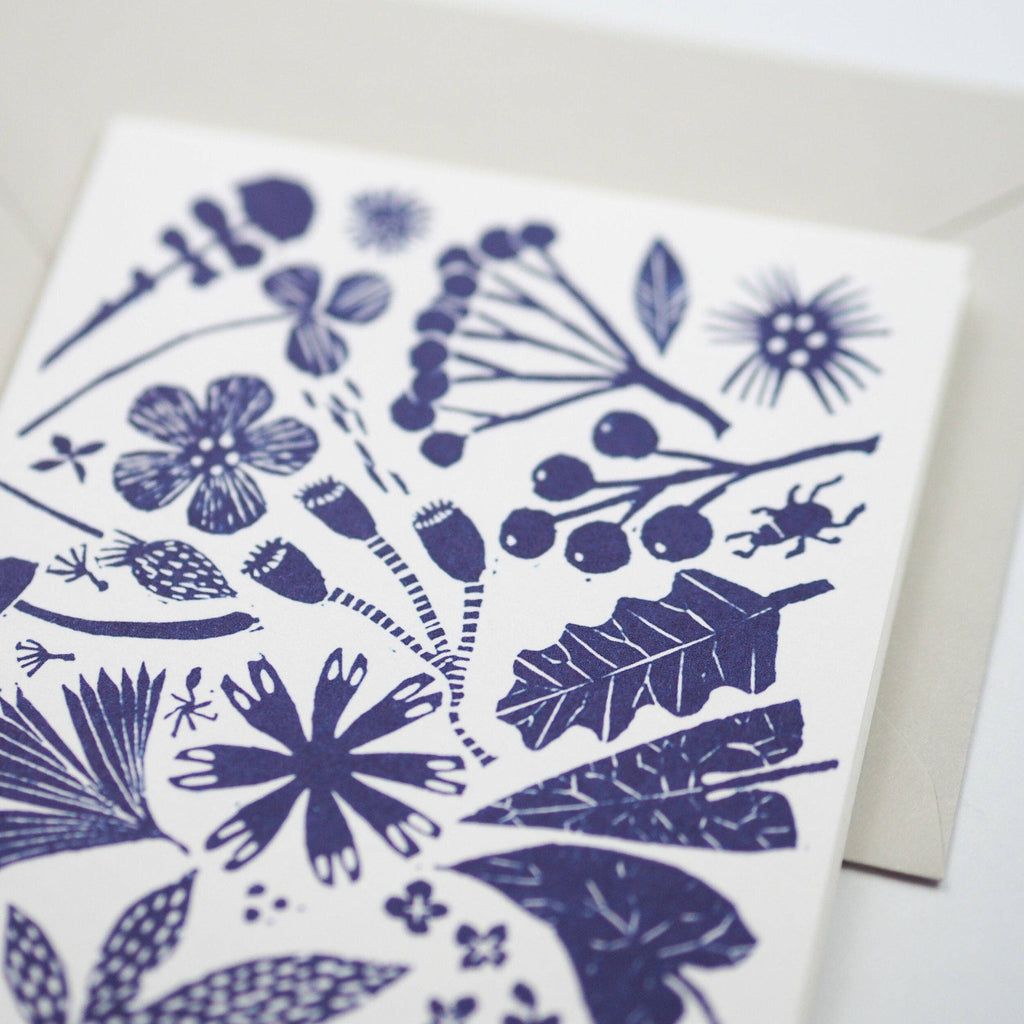 A floral card showing a lino print of an assortment of wild flowers and weeds. Digitally printed on high quality 300gsm card.